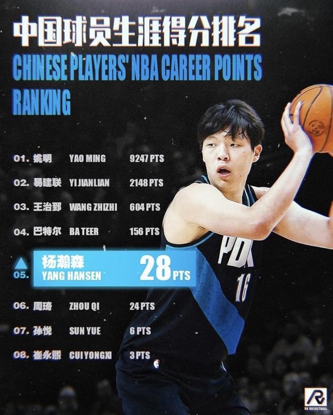 前不久,杨瀚森的NBA生涯总得分又涨了一点,在中国球员的NBA得分排行榜上悄悄往前挪了一名。原本只是榜单末尾的小字,如今开始慢慢往中间靠,这也让不少球迷开始好奇:照他现在这样的节奏打下去,将来这份榜单里,他的名字能停在什么位置?接下来要讨论的,就是杨瀚森如果在NBA真正站稳脚跟,他的生涯总得分大概能走到哪一步。(数据截至北京时间2025年11月24日)