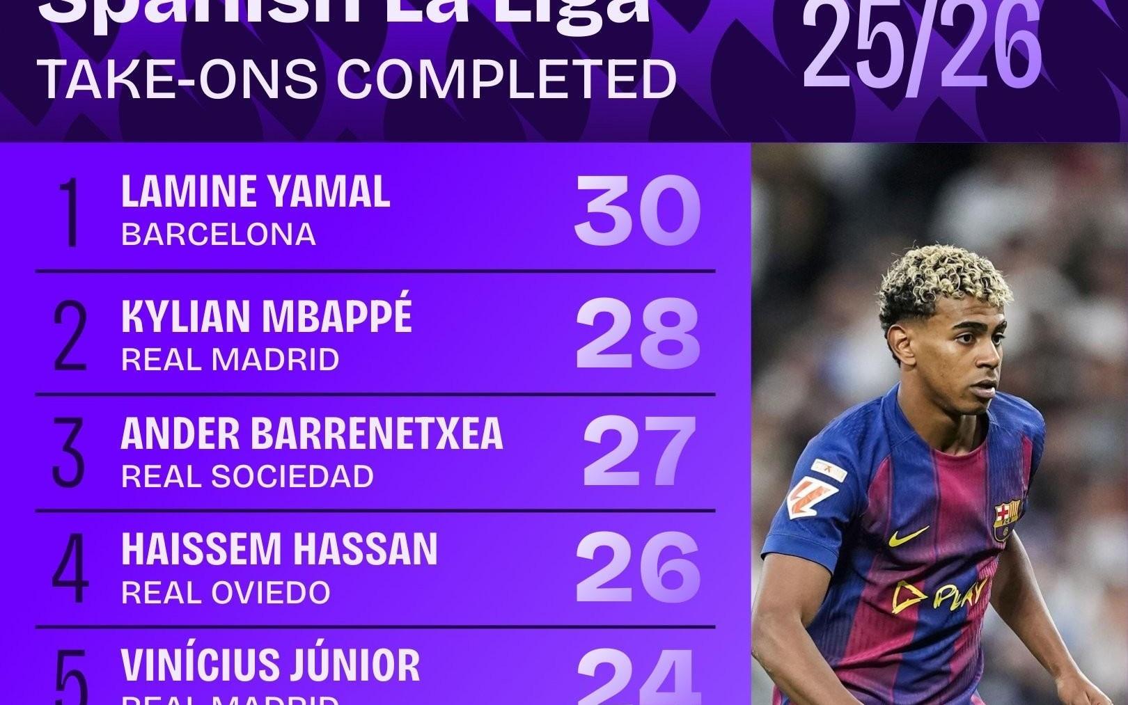 本赛季西甲完成过人最多榜:亚马尔30次居首,姆巴佩28次第二