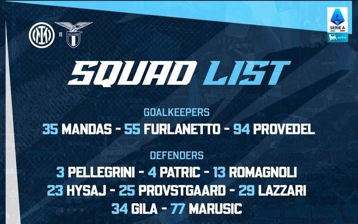 拉齐奥公布战国米名单:扎卡尼、佩德罗在列,6名球员缺阵